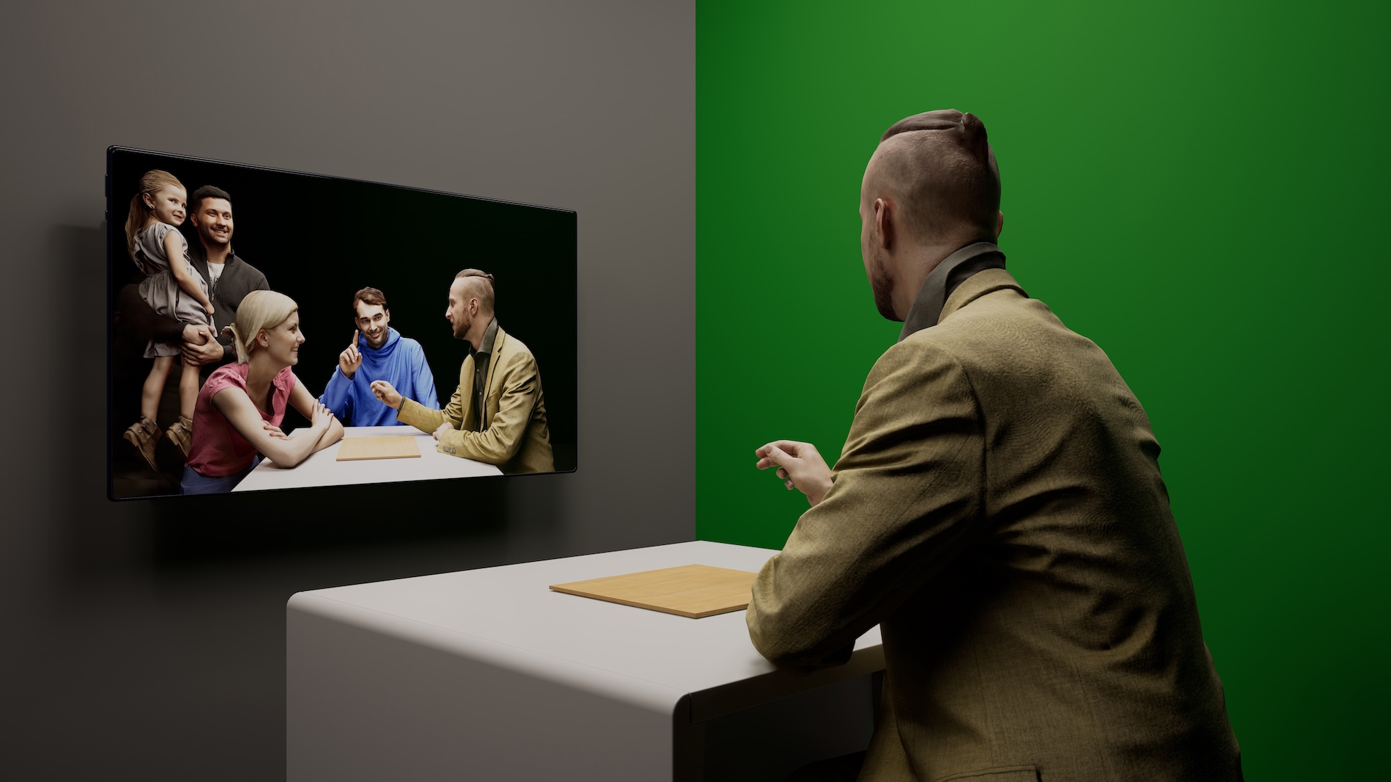 テーブルの前に座ると、自分の姿が目の前のディスプレイに現れます。会場内に設置されたもうひとつのテーブルの前に誰かが座ると、その人の姿も現れ、ひとつのテーブルを挟んで向かい合った様子を見ながら通話することができます。各テーブルには振動を触覚情報として伝送しあう仕組みが備わっており、音声での通話だけでなく、振動を介してもコミュニケーションをとることができます。体験者は、振動を伝送しあうことでひとつの場を共有する感覚を得ると同時に、対話している自分たちを客観的に眺めるという状況におかれます。≪コここ伝話≫は、コイグジスタンス(共在)感覚を醸成する新しいテレコミュニケーションの形を提案します。